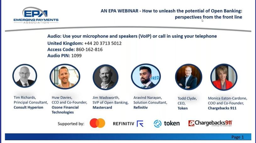 This webinar discusses why open banking is the transformation the payments industry has been waiting for, the potential barriers it faces along the way and what we can all do to make sure it is realised. Co-authors, Huw Davies of Ozone Financial Technologies and Tim Richards of Consult Hyperion, will be joined by a panel of speakers from Mastercard, Refinitiv, Token and Chargebacks911, providing a breadth of expertise and insight into open banking.